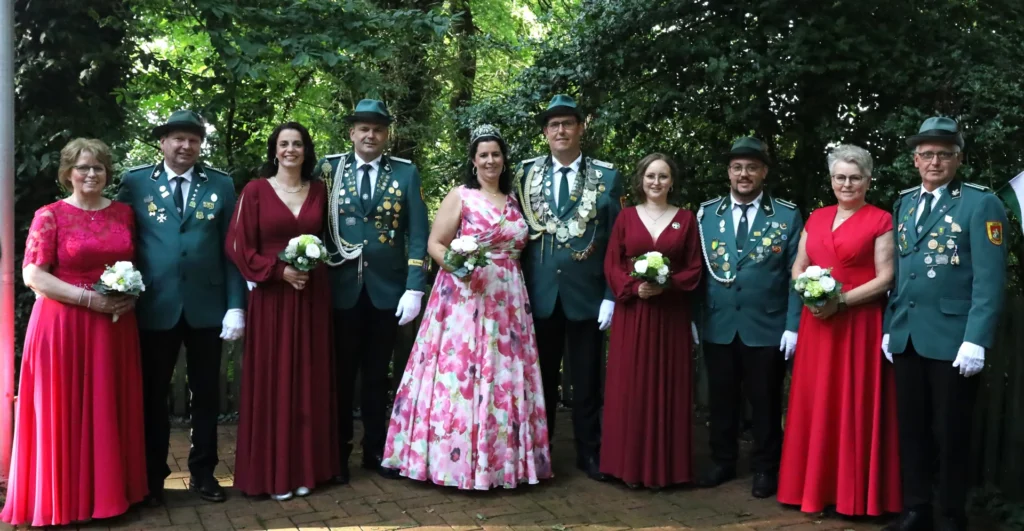 Die Regentschaft in Halen hat König Manfred Hitz mit seiner Königin Stefanie (Mitte) übernommen. Unterstützt werden sie bei ihrer Regierungsarbeit durch (von links) Kerstin und Jürgen Wichmann, Petra und Jörg Kranz, Daniela und Ansgar Voßmann sowie Monika und Christian Otten.