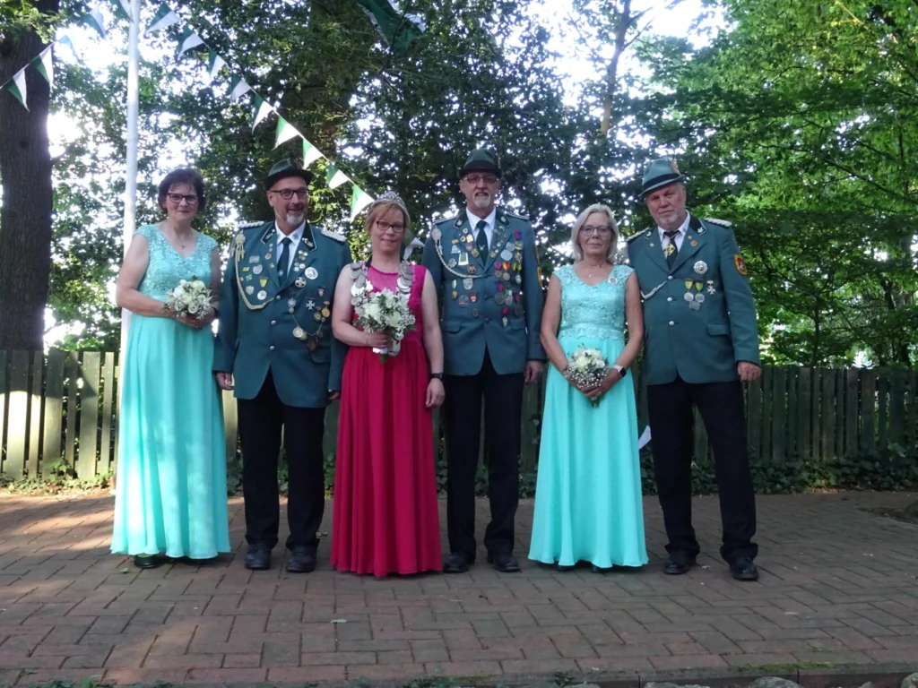 Die Regentschaft in Halen hat König Andreas Vaske mit seiner Königin Katharina (Mitte) übernommen. Unterstützt werden sie bei ihrer Regierungsarbeit durch (von links) Annette und Josef Reinke, Thomas und Sabrina Lübbe, Saskia und David Scheper sowie Marita und Reinhold Niemann